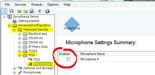- Select the microphone, and uncheck the enabled checkbox.