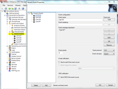 The Milestone XProtect Server is by default using TCP port 1234 for generic events. If required this port number can be modified from the Management Application software. Expand the Advanced Configuration folder, and click Events and Outputs. Here the port number can be changed if required.