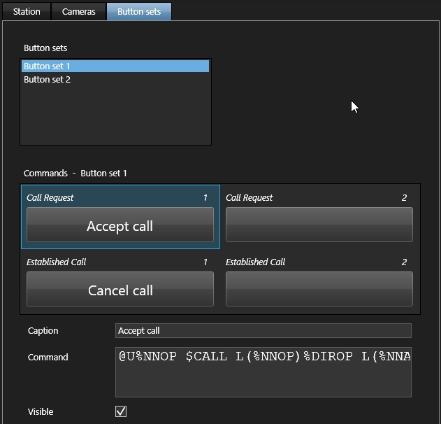 A button set is a set of 4 buttons, 2 for the call request state and 2 for the established connection state. Two button sets can be programmed and one button set can be assigned to each station. The appropriate buttons will become available when there is a call request or an established call related to that station.