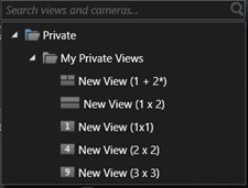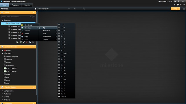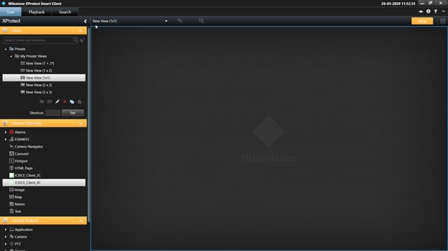 Ensure the “Setup” button in upper right corner so it is turned on with orange background as shown. The Milestone VMS is now in setup mode. It is now possible to define different views with different partitioning (split). For test it would be appropriate to create a view (1*1) and (3*3) (see picture above).
