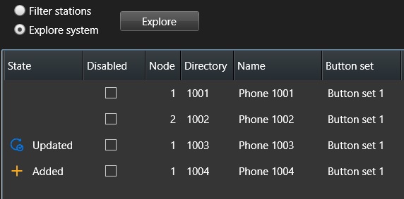 Select the radio-button Explore system and click Explore. All configured ICXs and stations will be discovered and listed with directory number and display text as defined in the ICX. Newly discovered stations are indicated with +Added, station of which the name has changed since last discovery are indicated with Updated.