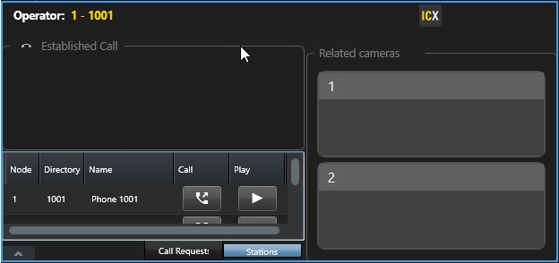 An established call is shown in the top section of the TAB. A timer shows how long the conversation has been going on. The cameras are displayed immediately when the call is accepted. This display can be overridden by clicking on a camera-icon in the call request list; return to the cameras associated with the established call by clicking the icon in the established call pane; this icon is only available if there are cameras associated with the station in conversation.