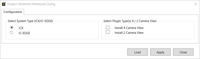 Select the type of system (ICX/IC-EDGE) and select which plugin version should be installed – 4 cameras, 2 cameras or both. Press “Apply” to execute the update. The program can also be used for changing system type in which case you press “Load” – makes the system change – and press “Apply”.