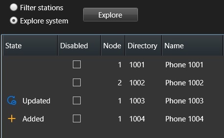 Select the radio-button Explore system and click Explore. All configured ICXs and stations will be discovered and listed with directory numbers and display text as defined in the ICX. Newly discovered stations are indicated with +Added, and stations whose name has changed since the last discovery are indicated with Updated.