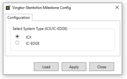 Select the type of system (ICX/IC-EDGE). Press “Apply” to execute the update. The program can also be used for changing the system type in which case you press “Load” – make the system change – and press “Apply”.