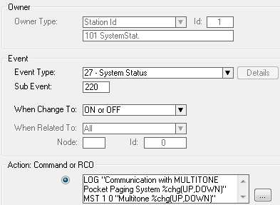 LOG "Communication with MULTITONE Pocket Paging System %chg(UP,DOWN)" MST 1 0 "Multitone %chg(UP,DOWN)"
