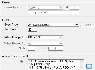 LOG "Communication with FIRE System %chg(UP,DOWN)" MST 1 0 "Fire System %chg(UP,DOWN)"