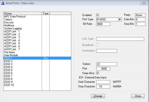 - In Exchange & System -> Serial Ports, select EDIO 1, and set the following parameters: