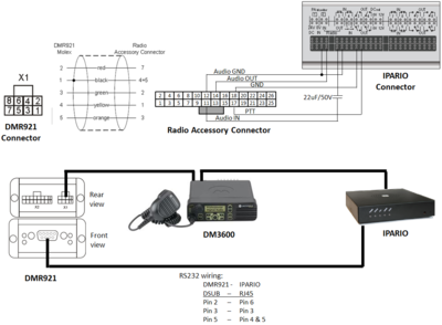 The connection between the MOTOTRBO gateway radio and the IPARIO is as follows: