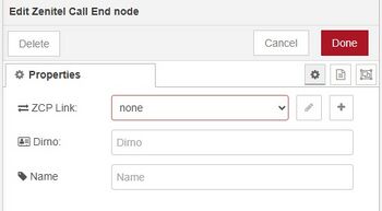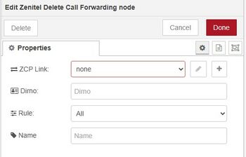 - ZCP Link: The IP address and port number of the ZCP that the Delete Call forwarding node should connect to (e.g. 10.9.8.7:8086)