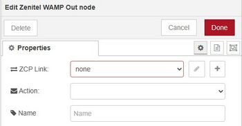 The WAMP Out node is a more generic node and has no filter options. It only provides a drop down menu with all the options for the different URI's available in the Zenitel Connect Pro WAMP API. Some of these options do not have dedicated nodes as described above as they are less used and only for very specific cases.