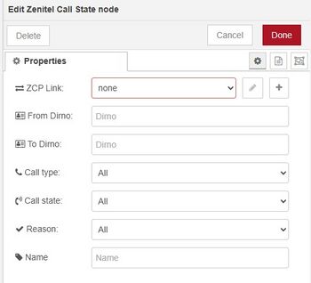 The Call State node subscribes to Call State e.g. Ringing, In call, related events in Zenitel Connect Pro. When a device changes its call state this node outputs a message. For example if the device changes state from Ringing to In call, this node outputs the new state In call