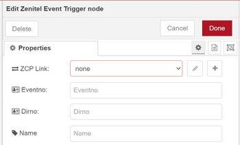 This node subscribes to Event trigger events in Zenitel Connect Pro. When a device dials a directory number that is configured as an Event trigger this node outputs a message.