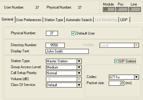 - From the Users & Stations window in AlphaPro, select a free user from the listbox, and enable the SIP station flag