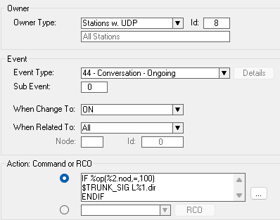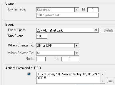 Example: The following event will report to the System Log and operate RCO 5 when the SIP Server on SIP Trunk node 100 goes up or down: