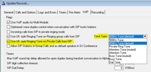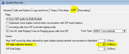 When using enbloc dialing, the ICX-AlphaCom will wait for 3 seconds (default) for more digits before the INVITE is sent on the SIP trunk. This timeout time is programmable from AlphaPro. Select Exchange & System > System > VoIP: