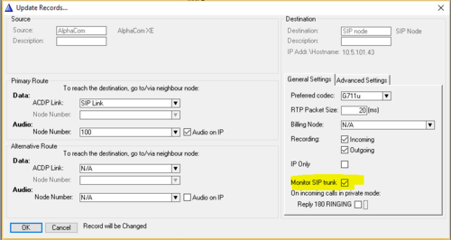 The monitoring is enabled from AlphaPro. Open Exchange & System > NetRouting, select the route to the SIP node, and press Change. Enable the flag "Monitor SIP Trunk":