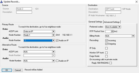 In the example above there will be maximum two voice calls via SIP Trunk node 100. A third call will be routed to trunk node 101.