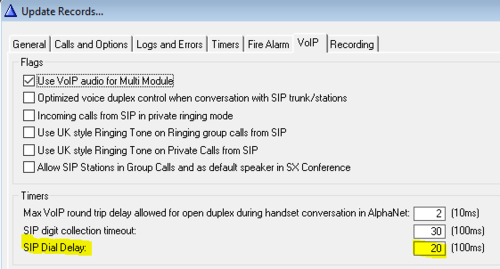 In AlphaPro -> Exchange & System -> VoIP, change SIP Dial Delay to 20 (2 sec). Default is zero: