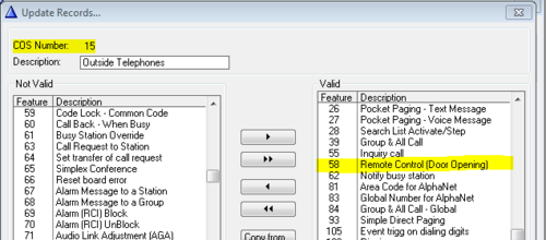 A SIP Trunk is automatically using Class of Service 15. This Class of Service group does not have the option for remote door opening enabled by default. In AlphaPro select the Class of Service button, select number 15 (Outside Telephones), press change and locate feature number 58 in the "Not Valid" list. Highlight Feature 58 and use the single arrow key to move it to the "valid" list.