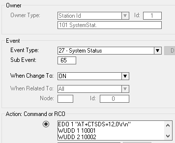 EDO 1 "AT+CTSDS=12,0\r\n" WUDD 1 10001 WUDD 2 10002 WUDD 3 10003 WUDD 4 10004 WUDD 5 10005 WUDD 6 10006 WUDD 7 10007 WUDD 8 10008 WUDD 9 10009 WUDD 10 10010 WUDD 11 10011 WUDD 12 10012 $ST L102 W600 L9000 LOG "AlphaCom startup. Send initiation data to Tetra: AT+CTSDS=12,0. Store ISSI numbers in UDDs"