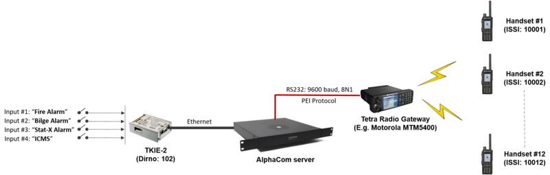 This article describes how alarm inputs on a TKIE-2 kit (or inputs from any other device connected to the AlphaCom) can generate text messages/alarms in Tetra radios.