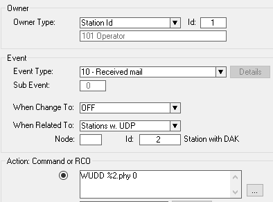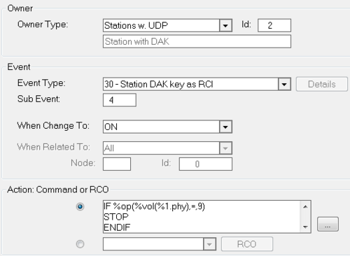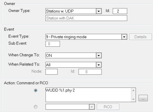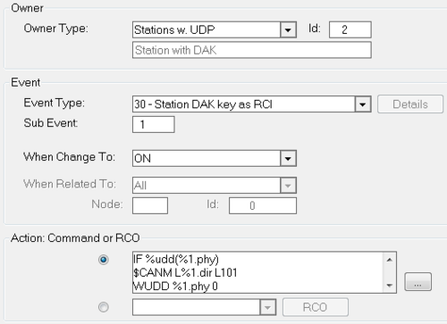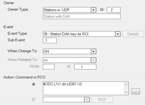 Option: If using a station with LED indications on the DAK keys (i.e. CRM-V or ECPIR-3P) the LED can be switched on and off to show status of the transfer. Change the action commands for the transfer event like this: (example shows red LED) Action commands: