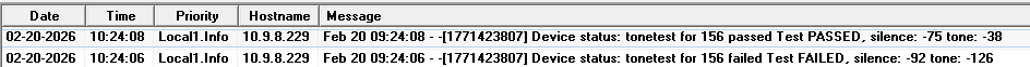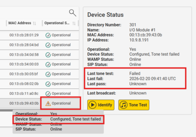 A failing tone test will also be shown in the Operational Status of the device with a warning sign: