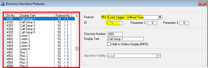 - The "Call setup", "Listen-In" and "Record" are Event Triggers, feature 52.
