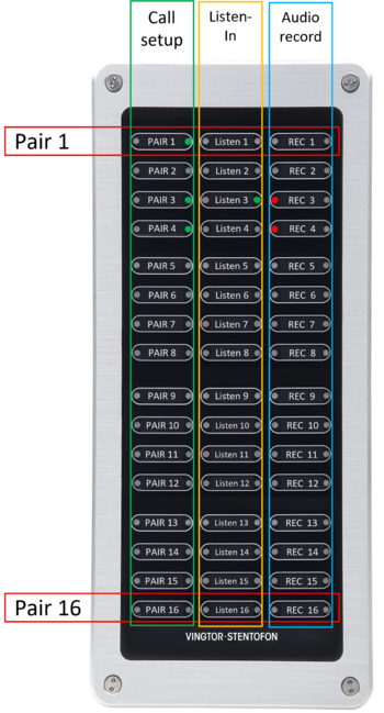 - Audio Recording: Press the "REC x" button to start audio recording of the conversation in the selected pair. Recording can be started only after the call has been set up. An active recording is indicated by red LED. Multiple conversations can be recorded at the same time.