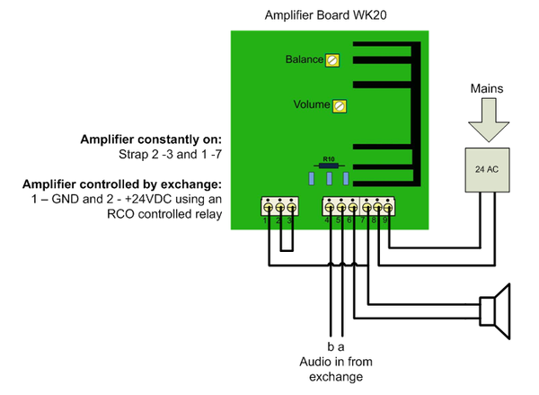 The amplifier can also be used with IP stations, connecting the line output of the IP station to the input of amplifier. Note that when used with IP stations the output power will be less than specified in the table below, because the input of the amplifier is designed for ASLT line levels (2.2 volt nominal, max 8 volts) and the line level from the IP stations is 0dBm signal (approx. 0.77 volts).