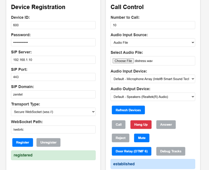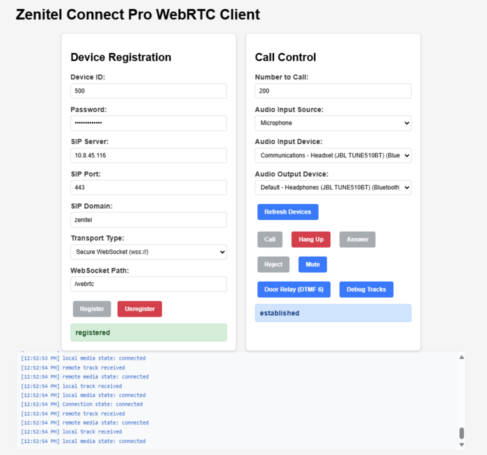It's possible to establish call between two web clients. This is useful in scenarios where there are multiple operator machines such as laptops or PC's. Each can run it's own instance of WebRTC client. To achieve this functionality, two or more WebRTC devices must be added to ZCP, each will have it's own directory number and SIP account password.